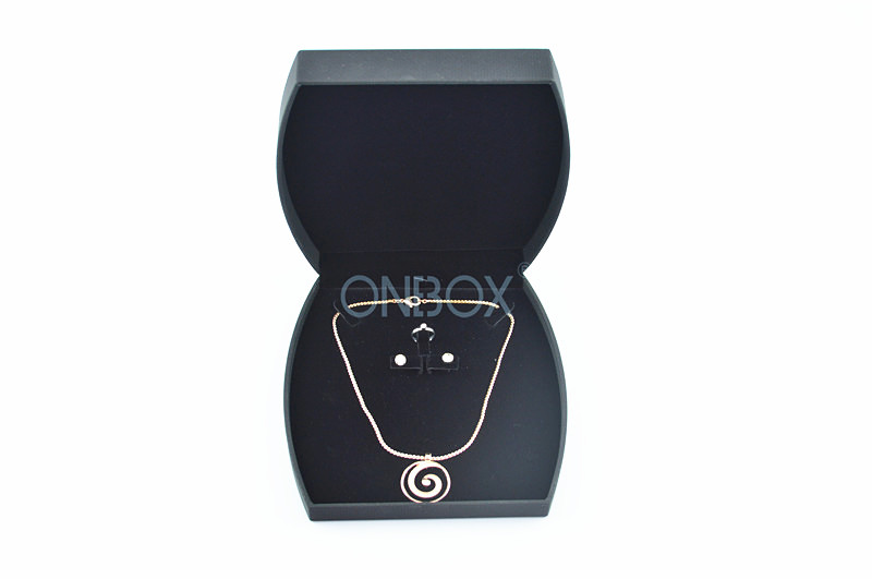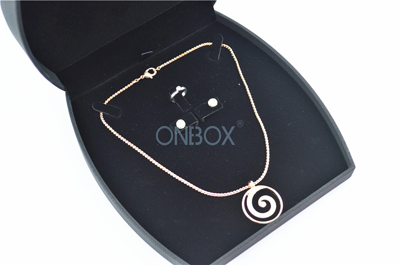 a. It's a fashion box design for a whole set jewelries : necklace , a pair of earrings ( / eardrops ) and a finger ring . Luxury design with soft padding on the top of the box , the box shape with beautiful curved edges with customized logo on top which is possible to print your favourite color ;