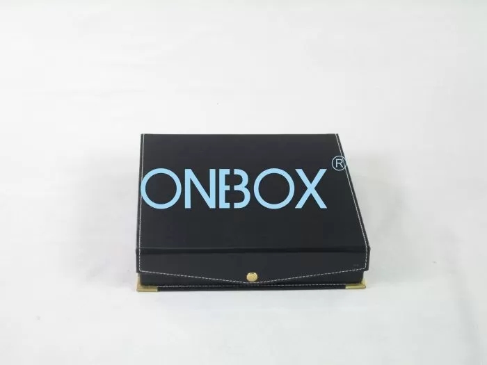 a. Cardboard box in black leatherette exterior with white stitching ;