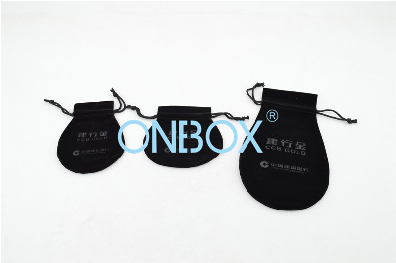 a. Black velvet pouch in pear shape with black hot stamping logo ;